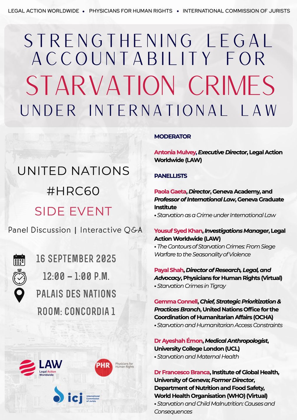 Strengthening Legal Accountability for Starvation Crimes under International Law | United Nations Human Rights Council 60th Session Side Event | Palais des Nations, Geneva, Switzerland | 16 September 2025